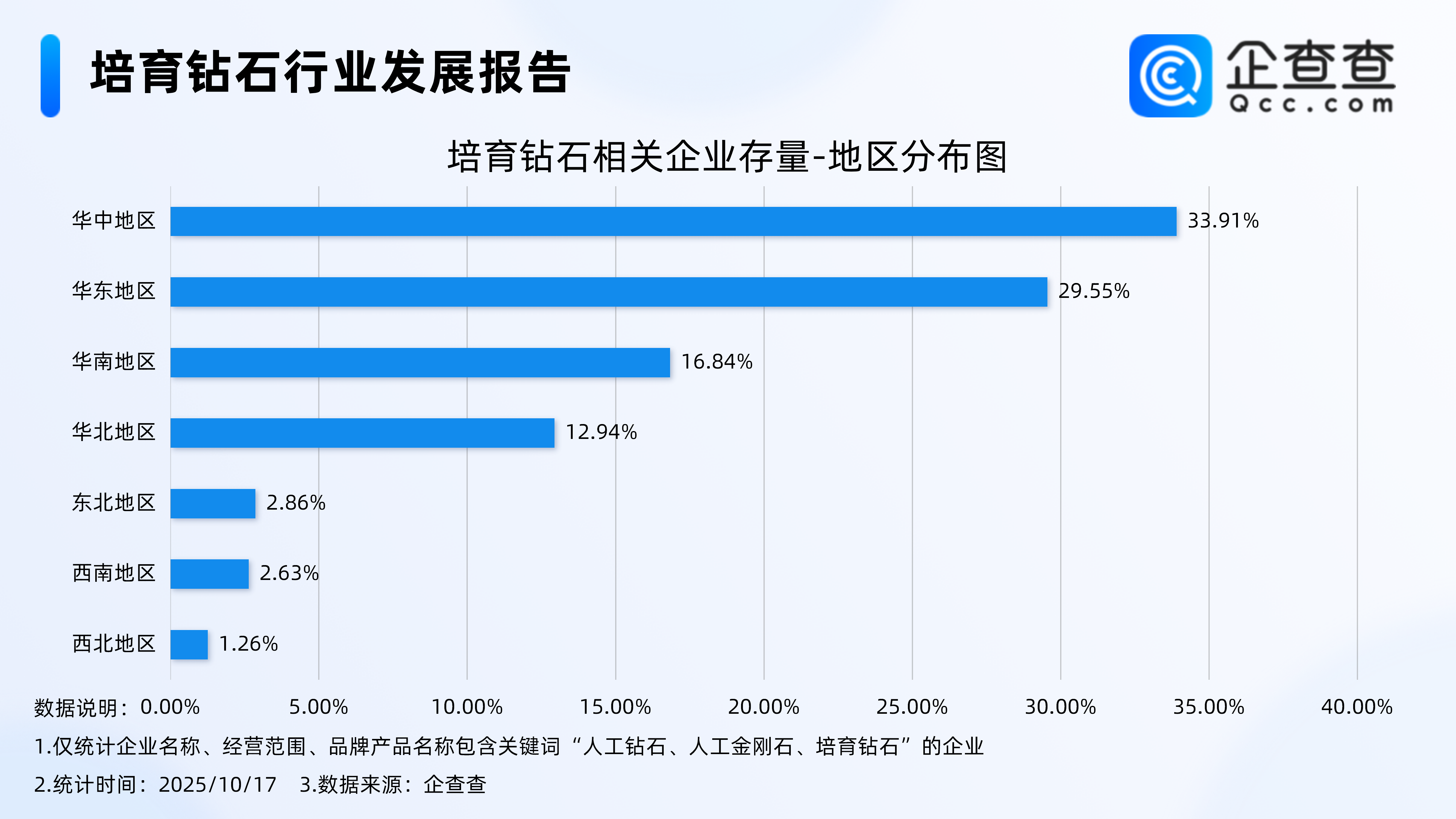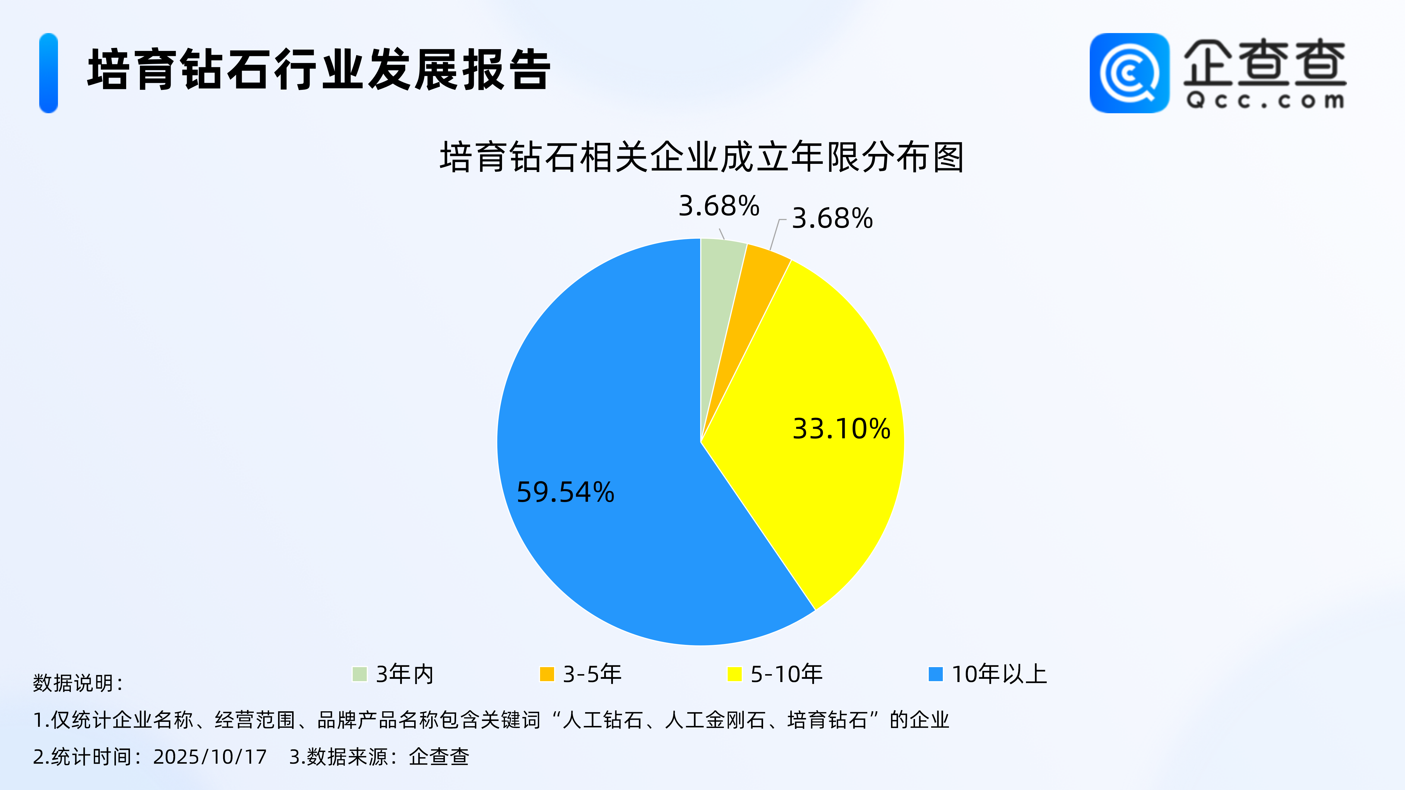 据媒体报道,近日,在第十五届中国河南国际投资贸易洽谈会上,力量钻石宣布通过高温高压法成功培育出一颗重达156.47克拉的钻石原石。并通过了国际宝石研究院(IGI)鉴定,该钻石为目前已知全球最大的人工培育钻石单晶,刷新了此前150.42克拉的世界纪录。此次突破标志着力量钻石的大颗粒单晶培育技术已迈入全球领先行列,并且进一步巩固了技术领先优势。企查查数据显示,国内现存培育钻石相关企业873家。从经营时间来看,培育钻石相关企业多为老牌企业,成立年限在10年以上的企业近六成,占比达59.54%。从地区分布来看,培育钻石相关企业多分布在华中地区和华东地区,分别占比33.91%、29.55%。从注册资本来看,培育钻石相关企业多为轻量级企业,注册资本在100万元以内的相关企业最多,占比30.68%。注册量方面,2024年全年注册15家相关企业,截至目前,今年已注册7家。1.现存培育钻石相关企业873家
