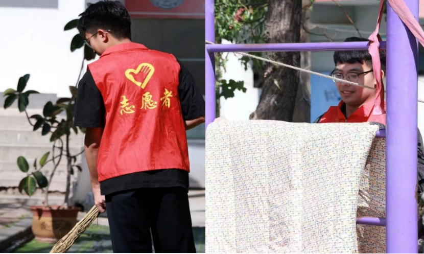 其中在本次志愿者活动中最让人们关注的是一位志愿者,他是2024级7中队司法警务专业的刘强。初夏的清晨,刘强已经早早地在养老院里仔细的清扫着院内的每个角落,保证老人有一个舒心、干净的居住环境。清扫完院内卫生之后又将老人的被子进行晾晒并仔细拍打晾晒的被褥,阳光穿过楼间距,将他的影子拉得很长,与晾衣绳上五颜六色的被子构成温暖的几何图形。