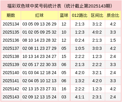 红球三区比2:3:1,质合比为2:4,012路比为4:1:1,蓝球为质数、0路号码。