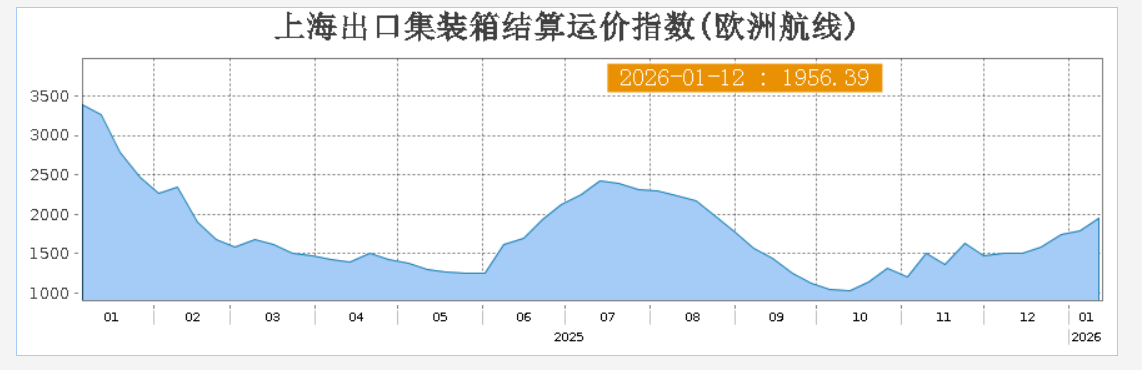 据上海航运交易所数据,截至2026年1月12日,上海出口集装箱结算运价指数(欧洲航线)报1956.39点,与上期相比涨8.9%。