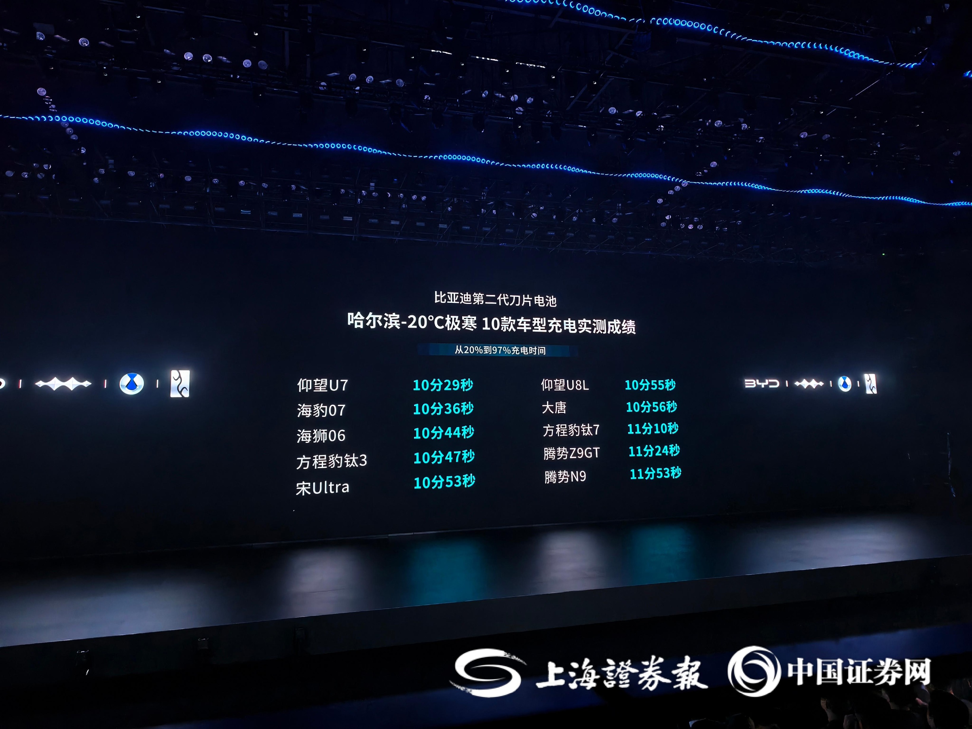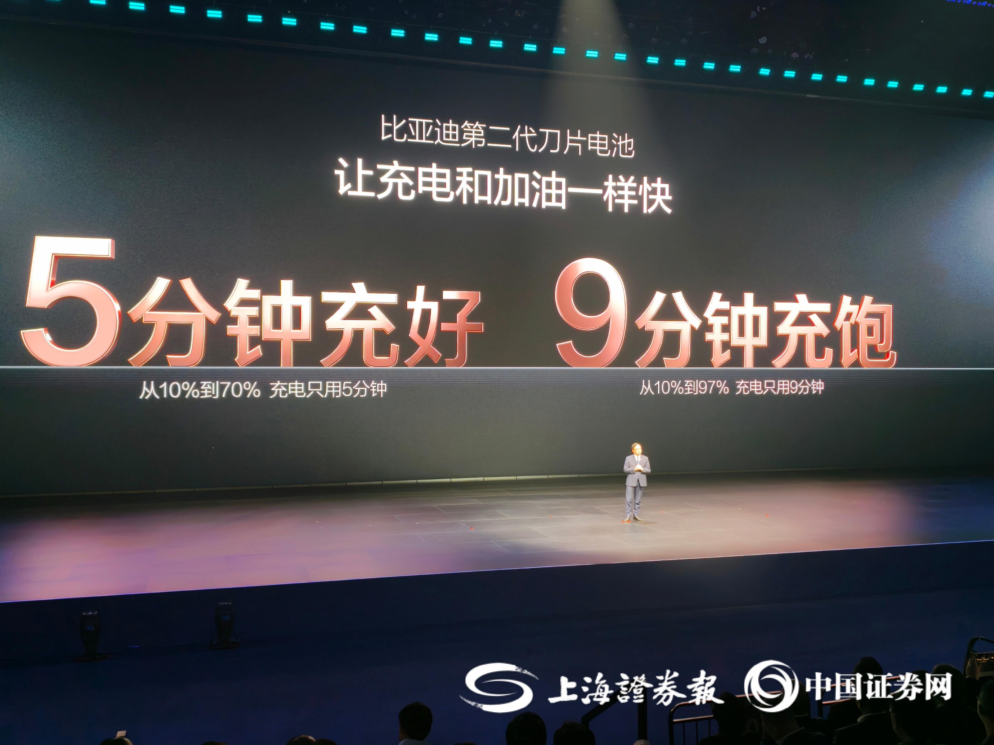 上证报中国证券网讯3月5日晚,在比亚迪第二代刀片电池暨闪充技术发布会上,比亚迪董事长兼总裁王传福表示,第二代刀片电池从10%到70%的充电速度仅5分钟,从10%到97%的充电速度仅9分钟。在零下20摄氏度的环境下,第二代刀片电池电量从20%至97%仅需不到12分钟。