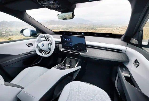 内饰部分参考海外版车型设计,全新宝马iX3长轴距版有望搭载宝马最新视平线全景显示系统,通过挡风玻璃投射出近40英寸画面,支持三区域分屏显示,适配偏光墨镜观看,还可记忆个性化设置并微调显示高度。平底运动方向盘采用上下切边造型,集成水晶触控按键,兼顾科技体验与操控手感。